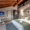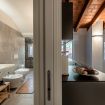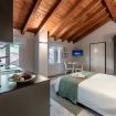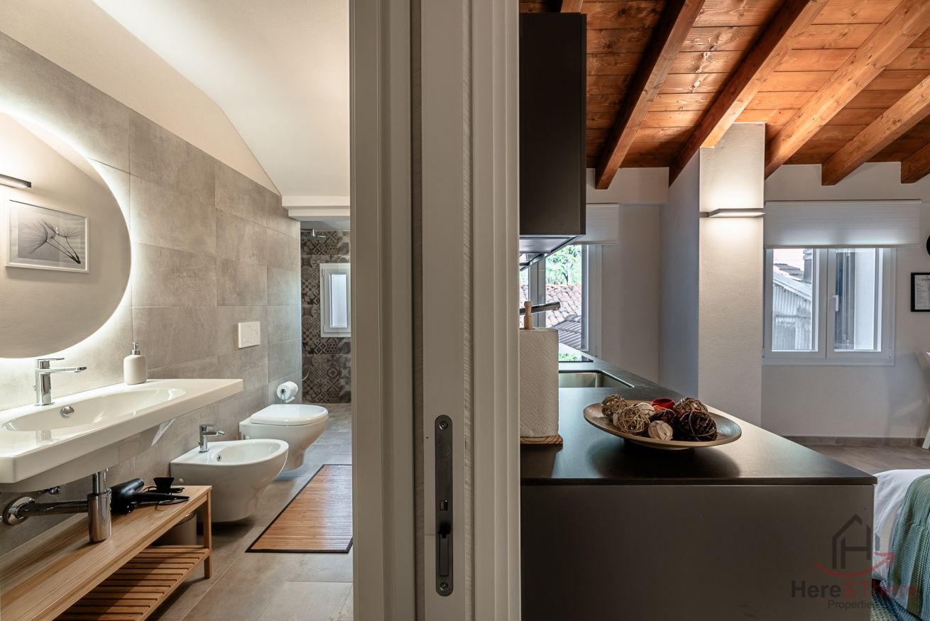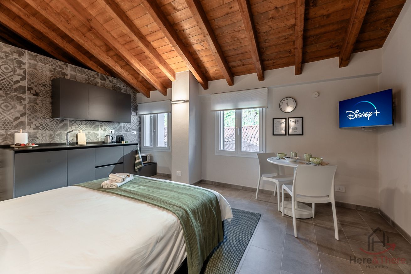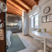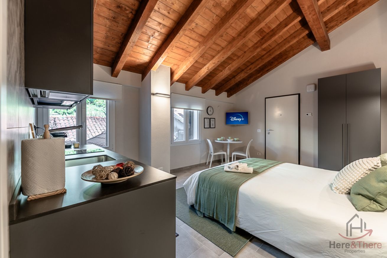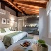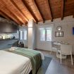 L'elemento centrale dell'alloggio è la camera da letto con generoso letto Queen Size inserita nell'open space, concept abitativo contemporaneo valorizzato dalle autentiche travi in legno e dall'impianto di condizionamento discretamente integrato.