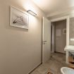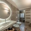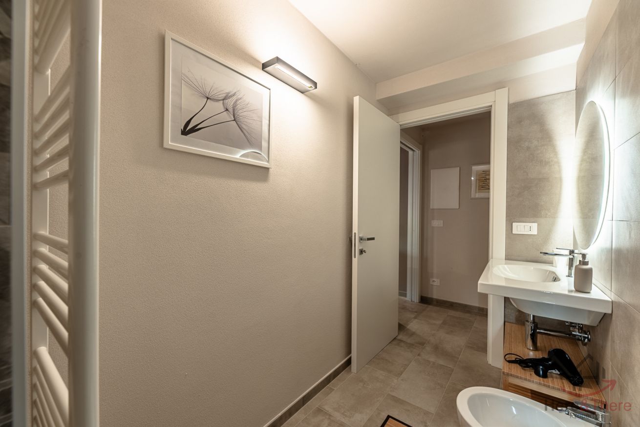 Arricchisce l'abitazione il raffinato bagno con ampia doccia, finiture ceramiche pregiate, specchio panoramico retroilluminato e asciugacapelli di qualità.