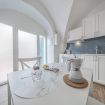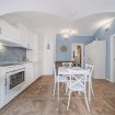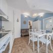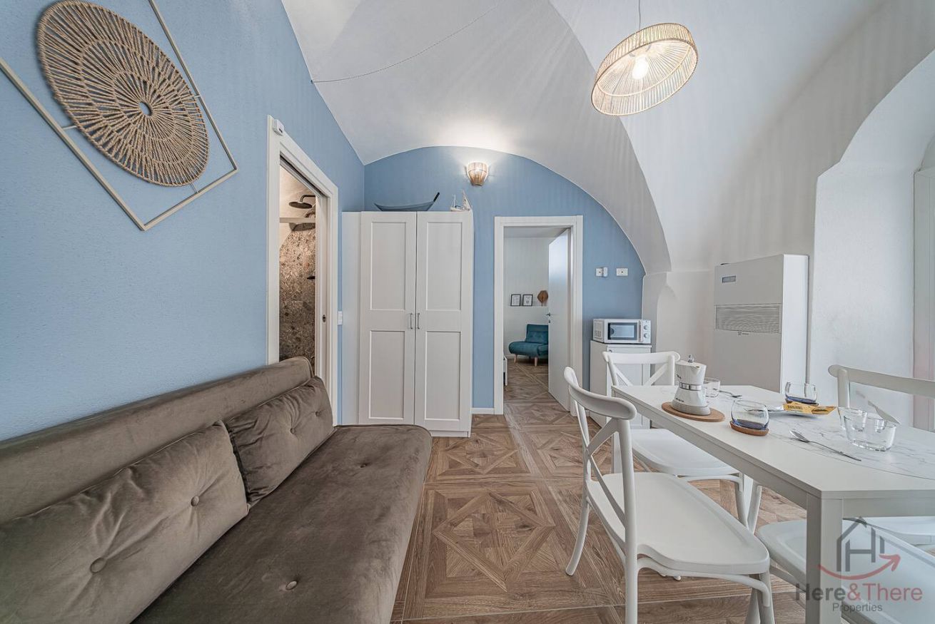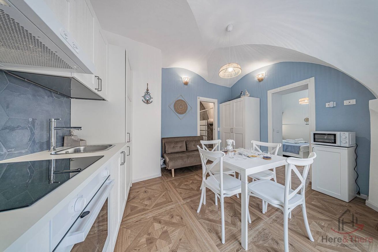 As you step inside the apartment, you will immediately find yourself in the living area, a welcoming space designed for relaxing moments. Here you will find a dining table where you can enjoy your meals and a fully equipped kitchen next to it, practical and functional for every need during your stay.