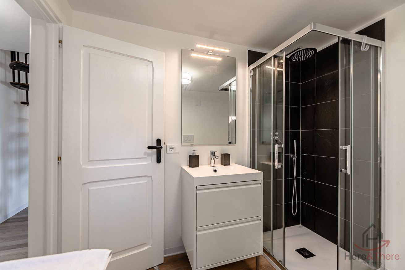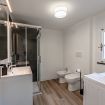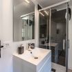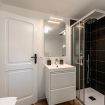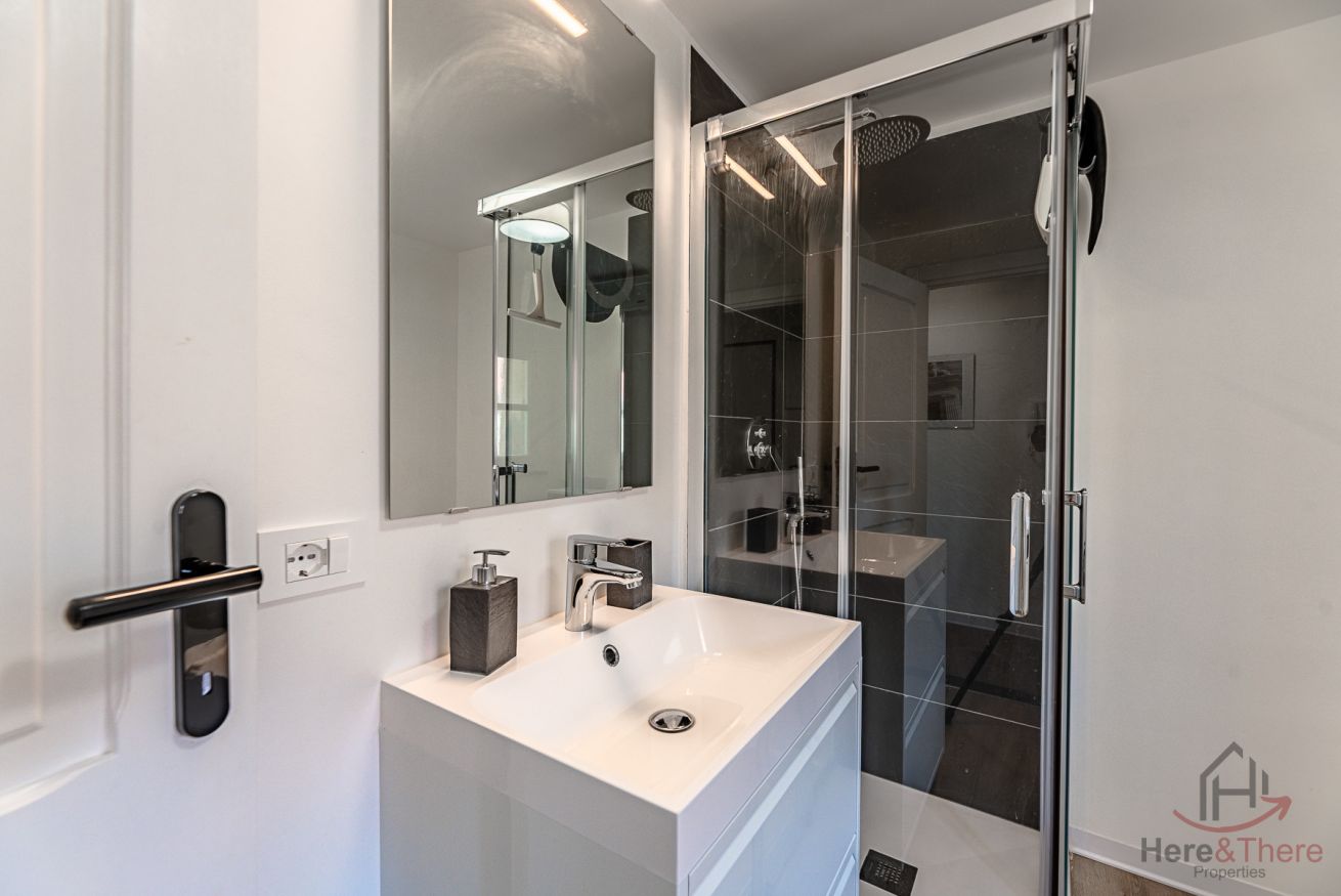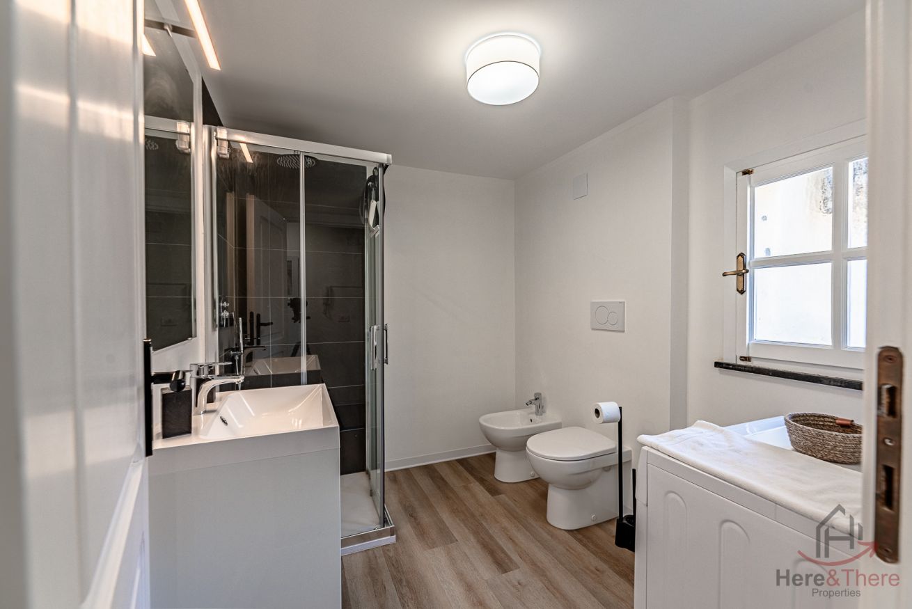 Accanto alla porta di ingresso scoprirete l'elegante bagno, arredato con sanitari completi in ceramica, ampio specchio, asciugacapelli e pratico box doccia.