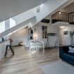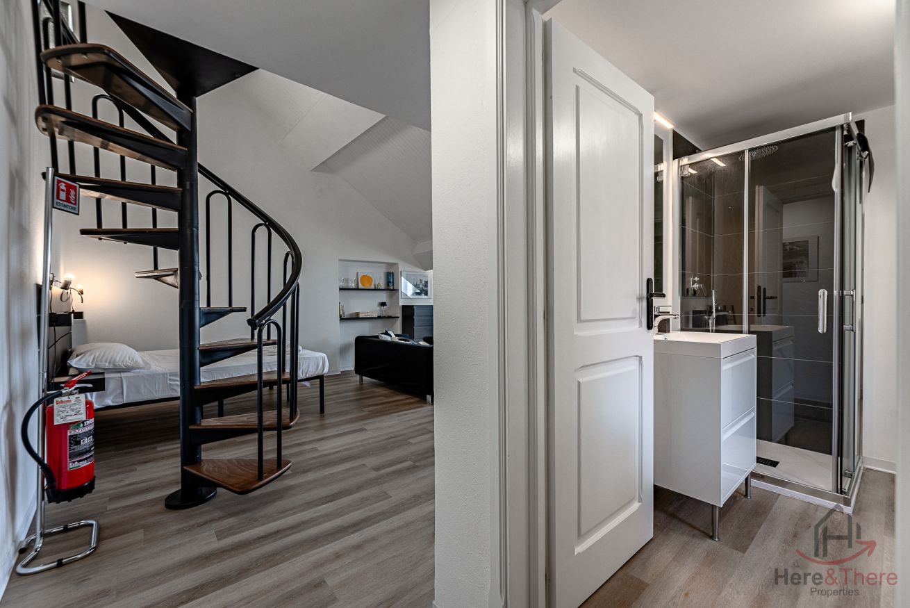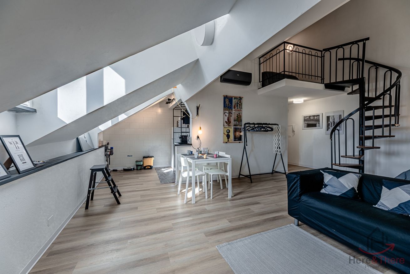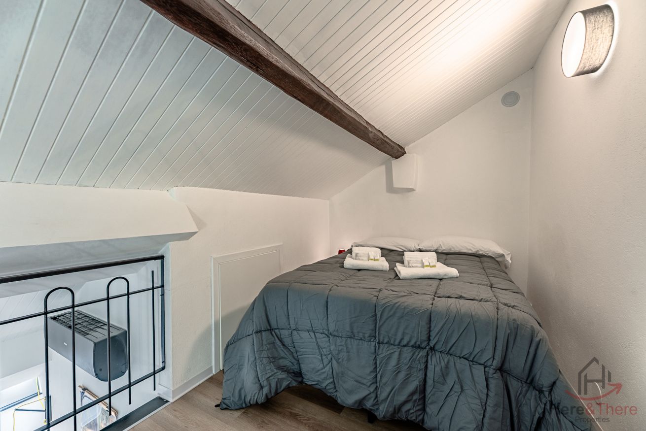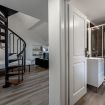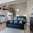 Una caratteristica scala a chiocciola conduce al soppalco, dove vi attende un secondo letto Queen Size, creando uno spazio intimo e raccolto sotto il tetto del palazzo storico.
