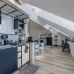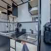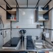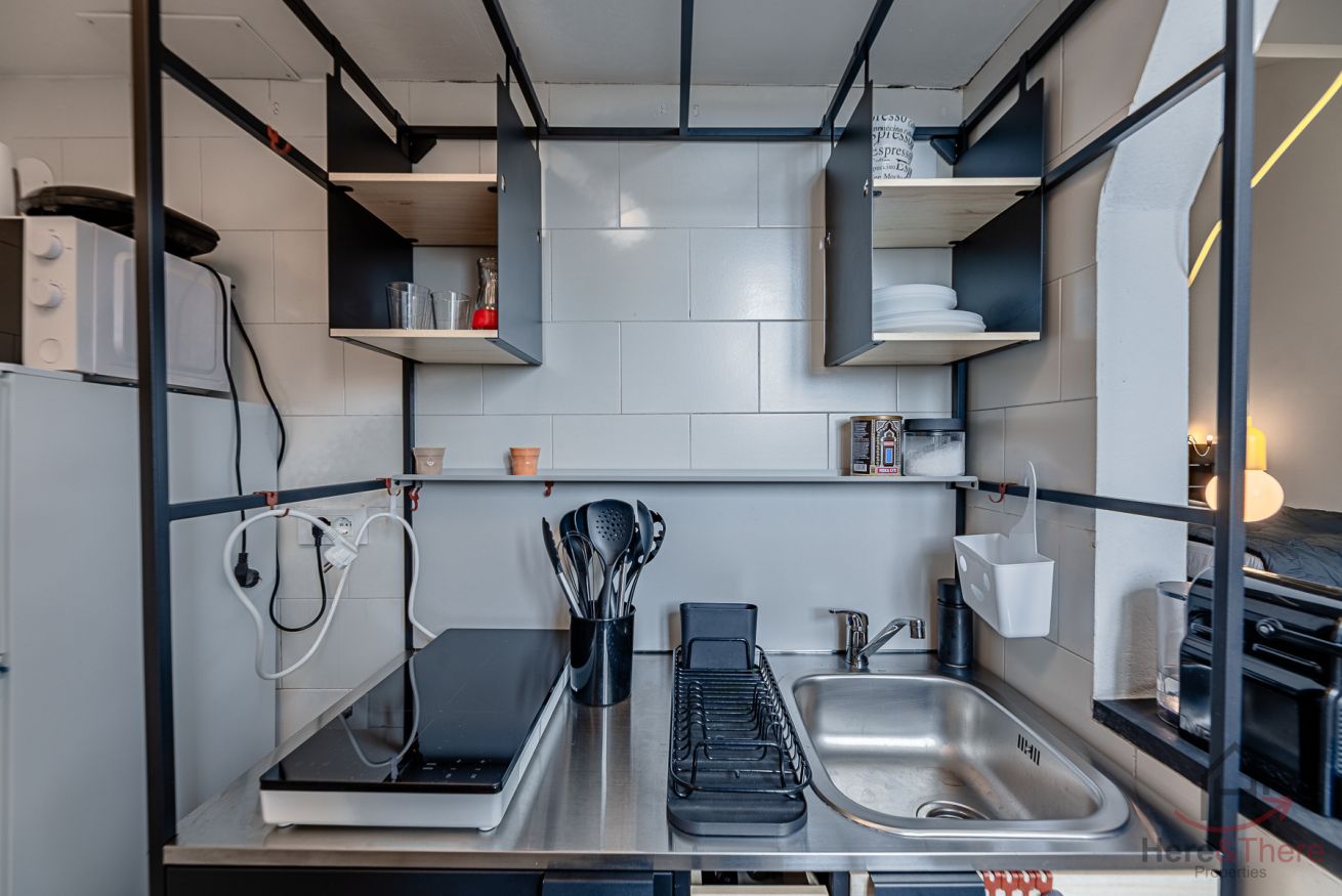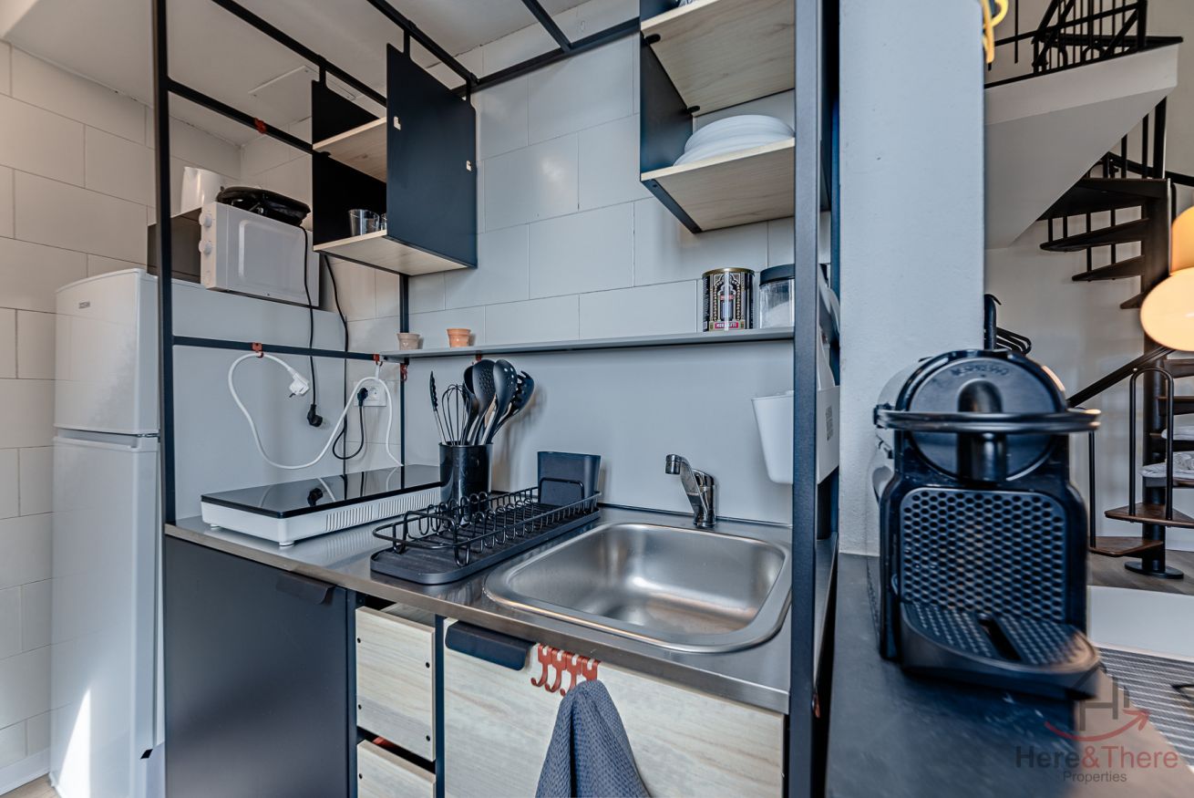 L'angolo cottura completamente attrezzato si integra armoniosamente nello spazio, con tutto il necessario per preparare i vostri pasti.