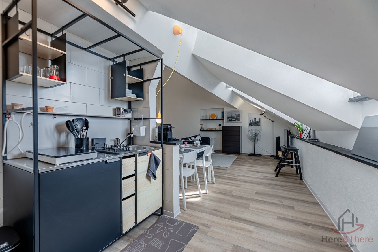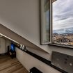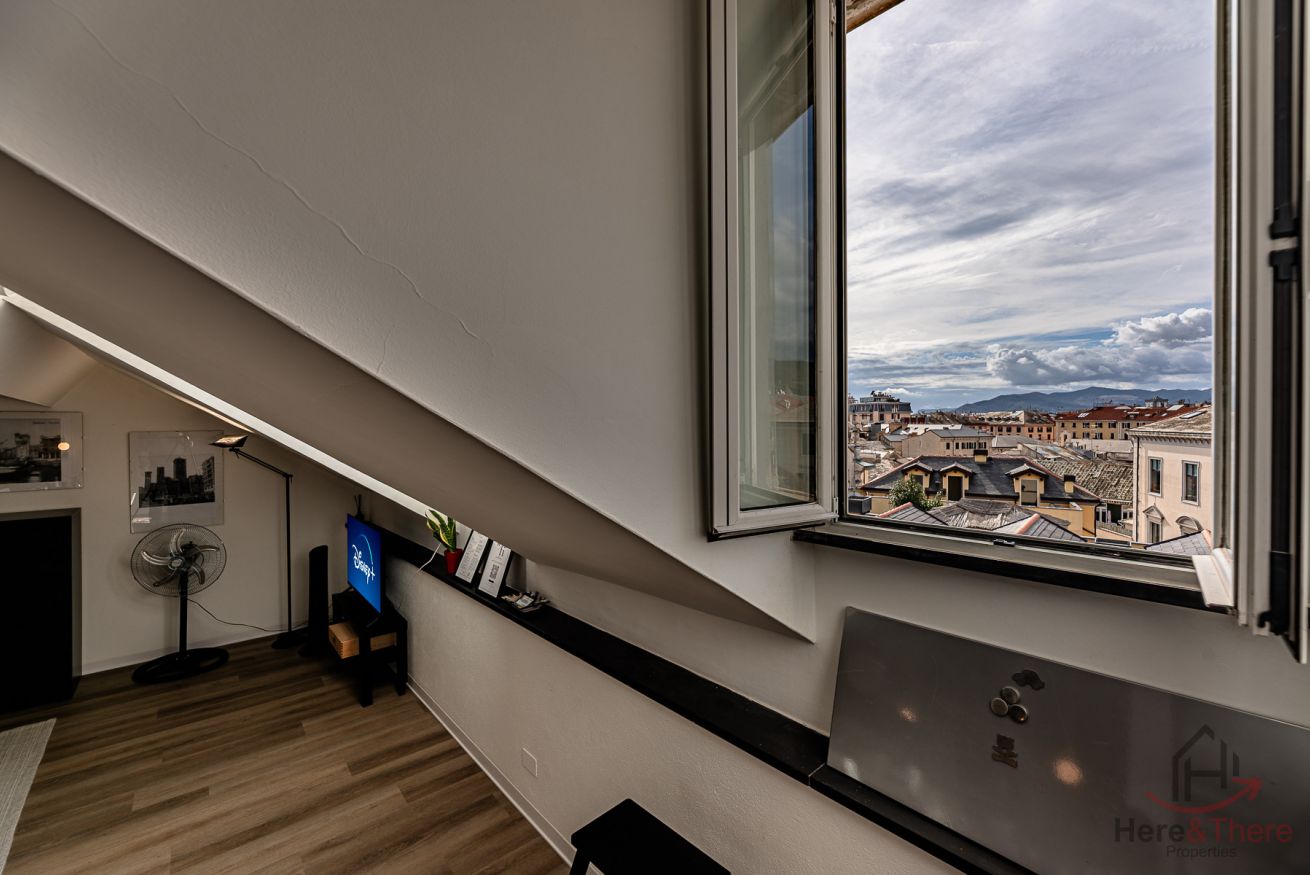 Due ampie finestre inondano l'ambiente di luce naturale e regalano una suggestiva vista urbana sulla città.