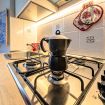 A destra dell’ingresso e davanti a voi, troverete la cucina attrezzata di ogni comfort. I soggiorni più lunghi non saranno un problema, avendo a disposizione, un forno a microonde, piano cottura, frigo e freezer, bollitore, macchina per il caffè in cialde Dolce Gusto e una Moka per un vero caffè italiano.