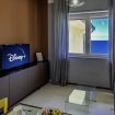 Un comodo divano è posto proprio d'innanzi alla Smart TV, Full HD ad alta definizione.