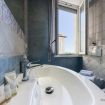 Lo spazioso bagno finestrato con scorcio sul mare è arredato con sanitari completi in ceramica, ampio specchio, lavabo, asciugacapelli e doccia.