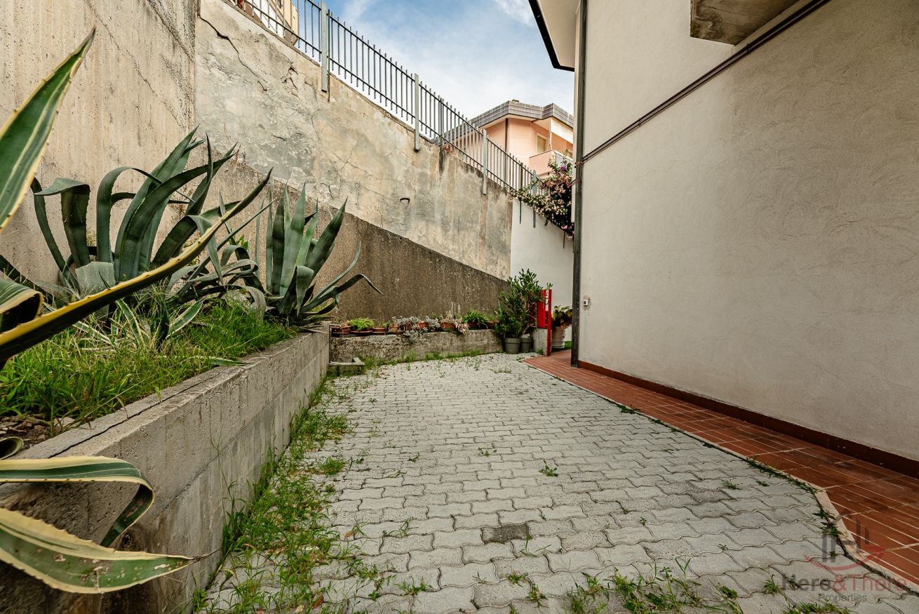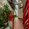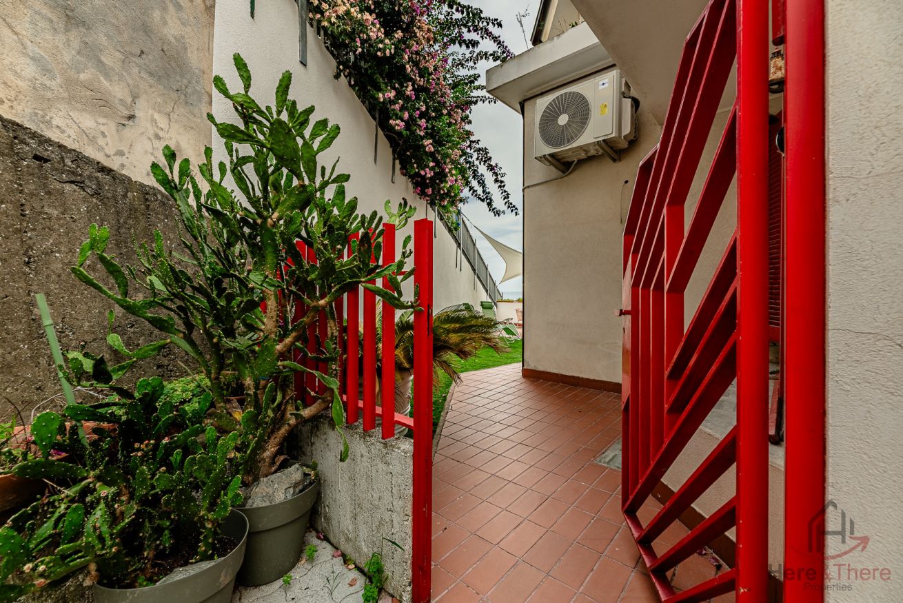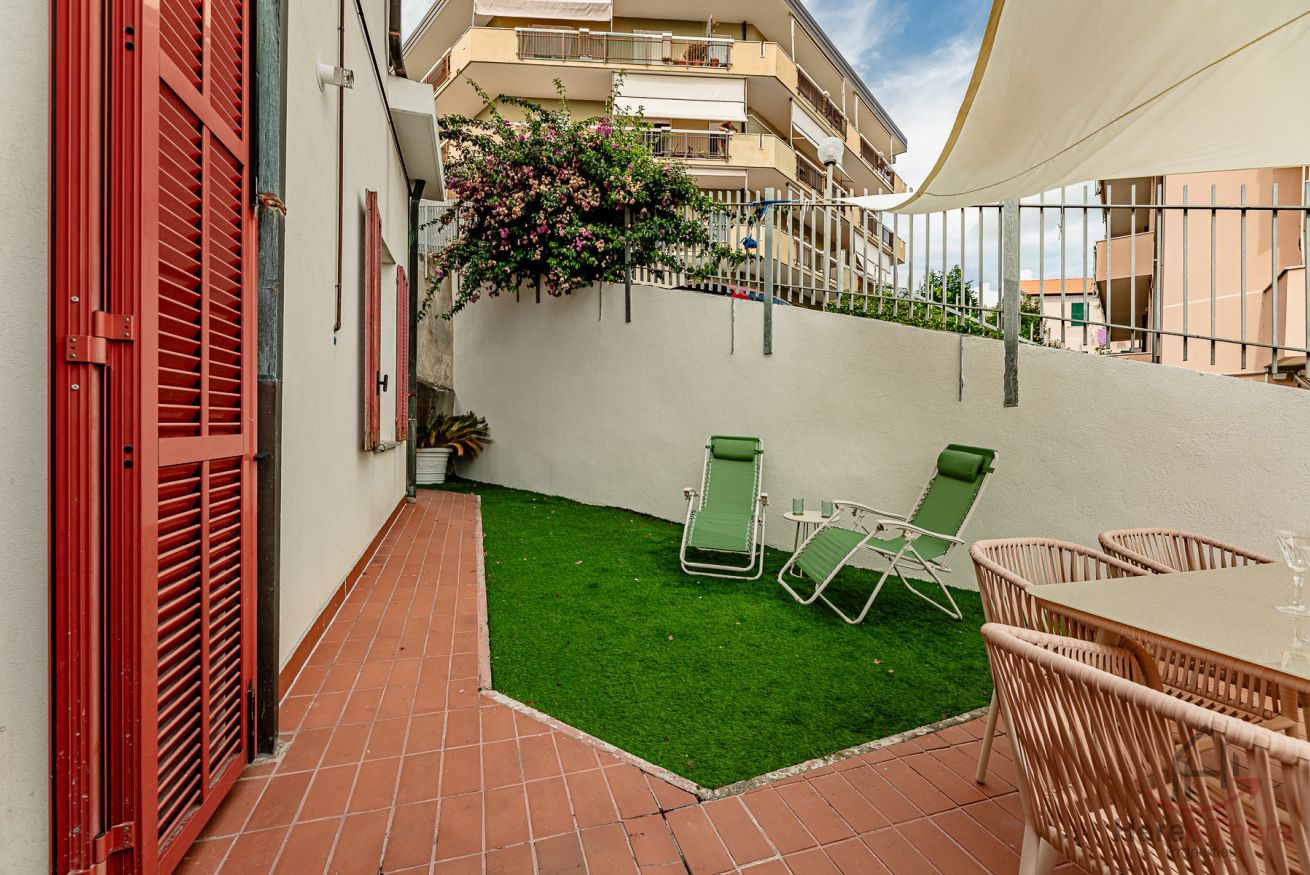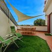 Da qui si accede alla terrazza con giardino privato, arredata con tavolo, sedie e sdraio per godere del sole o cenare all’aperto ammirando il panorama.