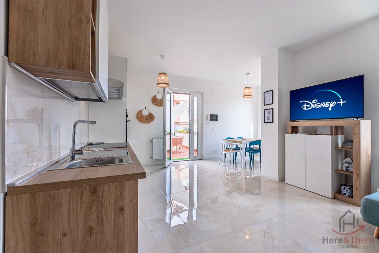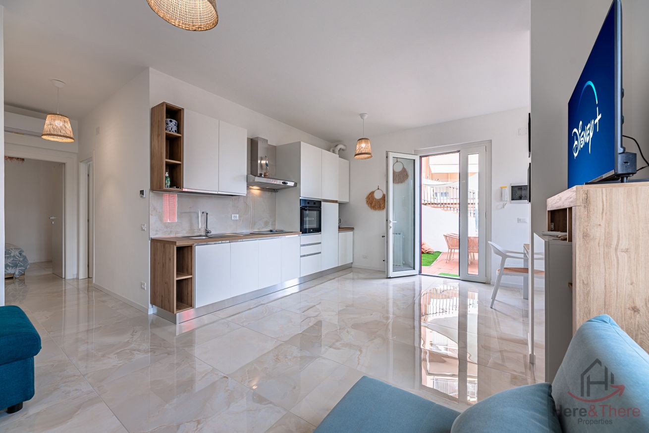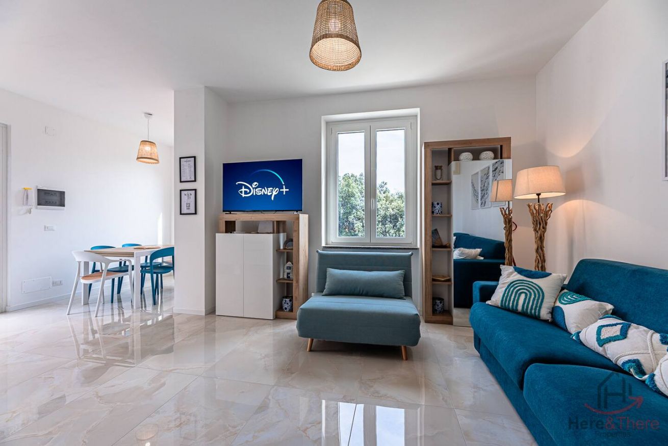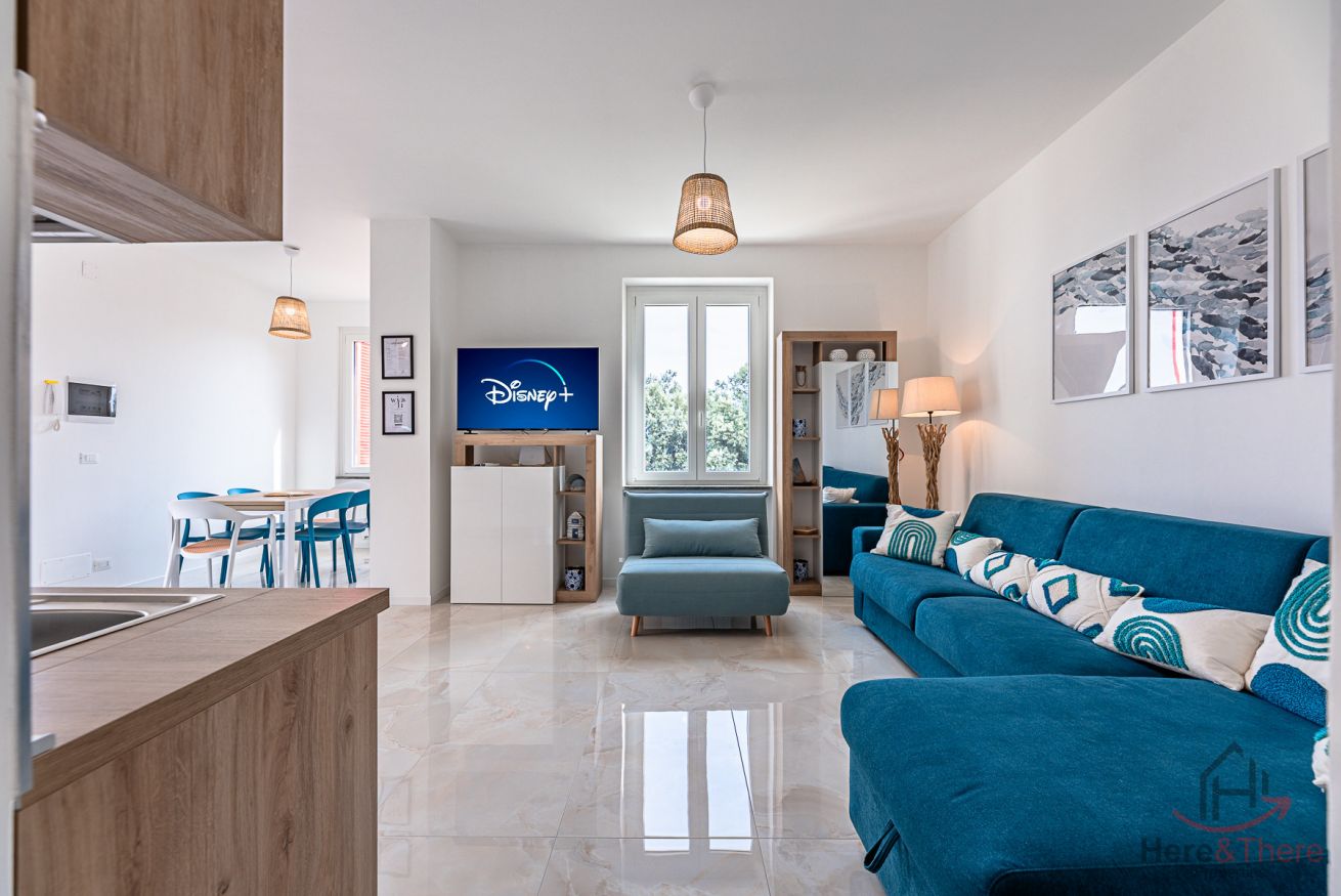 Varcata la soglia, vi troverete nell’ampia zona living, dove un spazioso divano di fronte alla grande Smart TV vi inviterà al relax dopo una giornata di sole e mare.