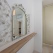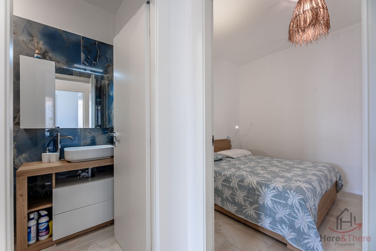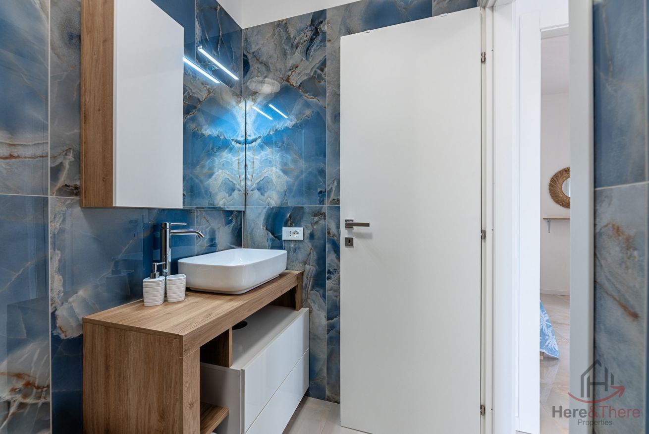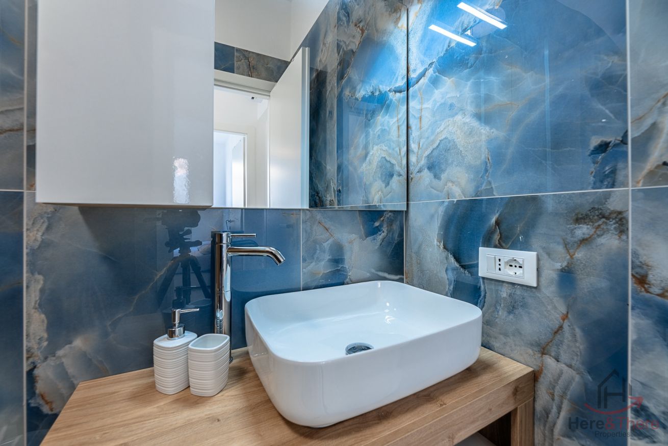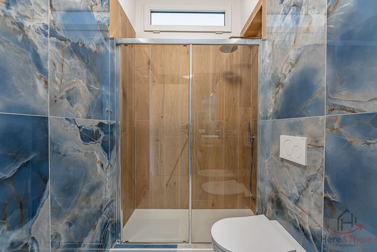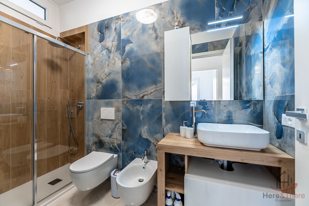 Il bagno, elegante e funzionale, è completo di sanitari in ceramica, doccia, ampio specchio e asciugacapelli.