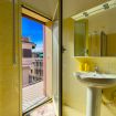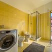 Proseguendo oltre, il generoso bagno è arredato con sanitari completi in ceramica, ampio specchio, asciugacapelli e doccia.